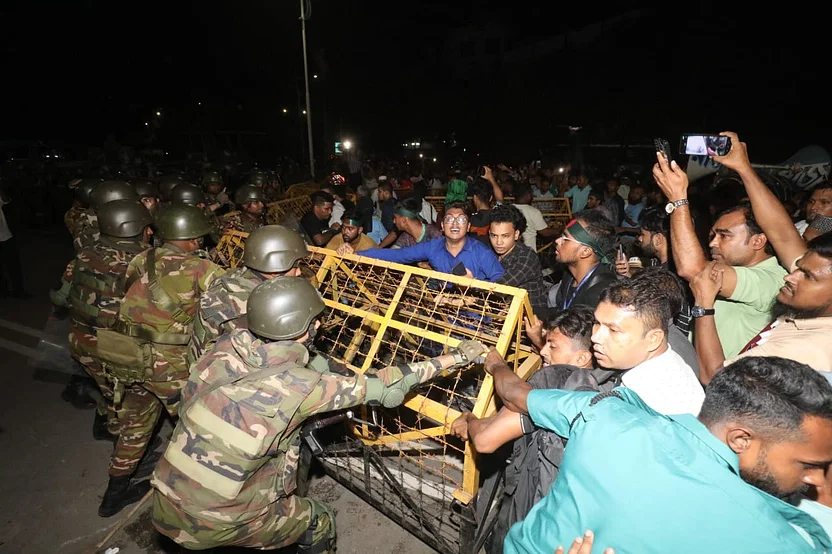 প্রত্যক্ষদর্শীরা জানান, রাত ৮টা ২০ মিনিটের দিকে হঠাৎ বিক্ষোভকারীরা বঙ্গভবনের বাইরের ব্যারিকেড ভাঙার চেষ্টা করেন। এ সময় পুলিশ ও সেনাবাহিনীর সদস্যরা বাধা দেন। একপর্যায়ে বিক্ষোভকারীরা ব্যারিকেডের বাইরে থাকা পুলিশ সদস্যদের ওপর হামলার চেষ্টা করেন। এমন পরিস্থিতির মধ্যে রাত ৮টা ২৫ মিনিটের দিকে পুলিশ একটি সাউন্ড গ্রেনেড ছোড়ে। এরপর উত্তেজনা আরও ছড়িয়ে পড়ে। এ সময় সেনাবাহিনীর সহায়তায় পুলিশ সদস্যদের ব্যারিকেডের ভেতরে নিয়ে যাওয়া হয়।